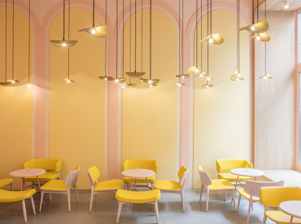In dit restaurant is gewerkt met één van de meest actuele kleurencombinatie van dit moment: geel en roze. Met lichtgekleurd houtfineer in de afwerking voor de kozijnen/vensterbanken en de goudkleurige lampen krijgt de sfeer een luxere uitstraling. De hoge bogen met reliëf zijn als wanddecoratie het verrassende element in de ruimte.